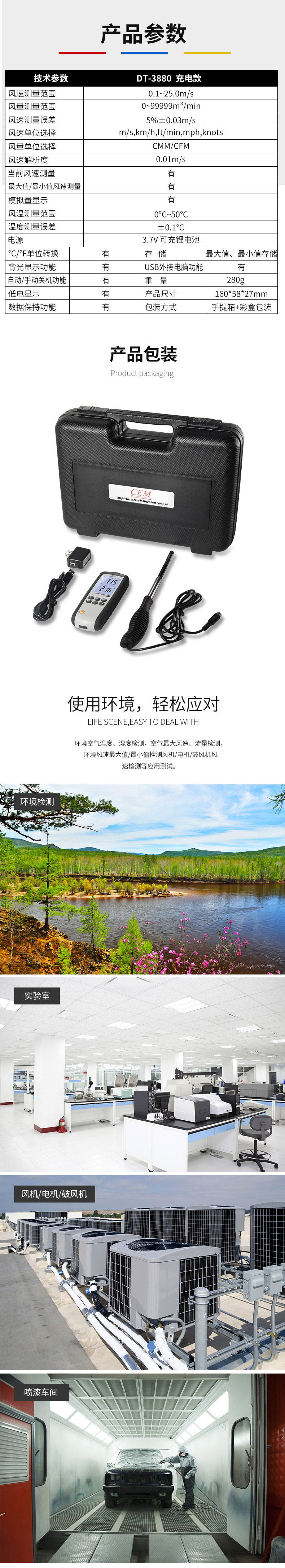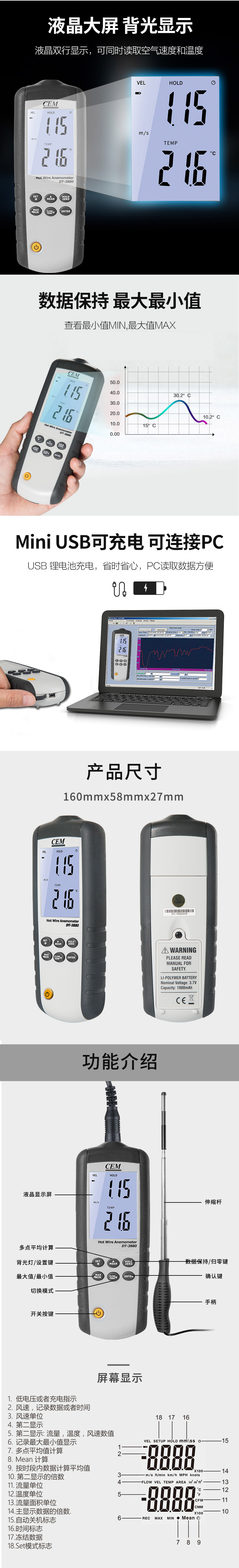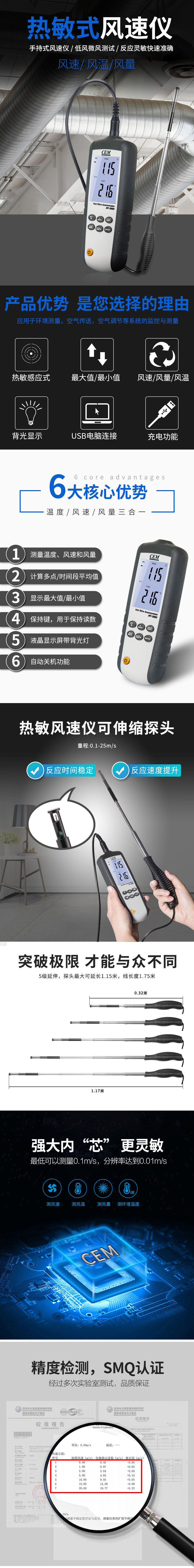DT-3880熱敏式風速儀是CEM新推出的一款性能穩(wěn)定、高精度、帶可充電鋰電池的熱敏式風速儀,1.5M的熱敏式探頭,可測量風速,風溫,風量以及環(huán)境溫度。在室內空氣、工業(yè)健康環(huán)境、管道、暖通空調等領域都能發(fā)揮準確測量的檢測功能。