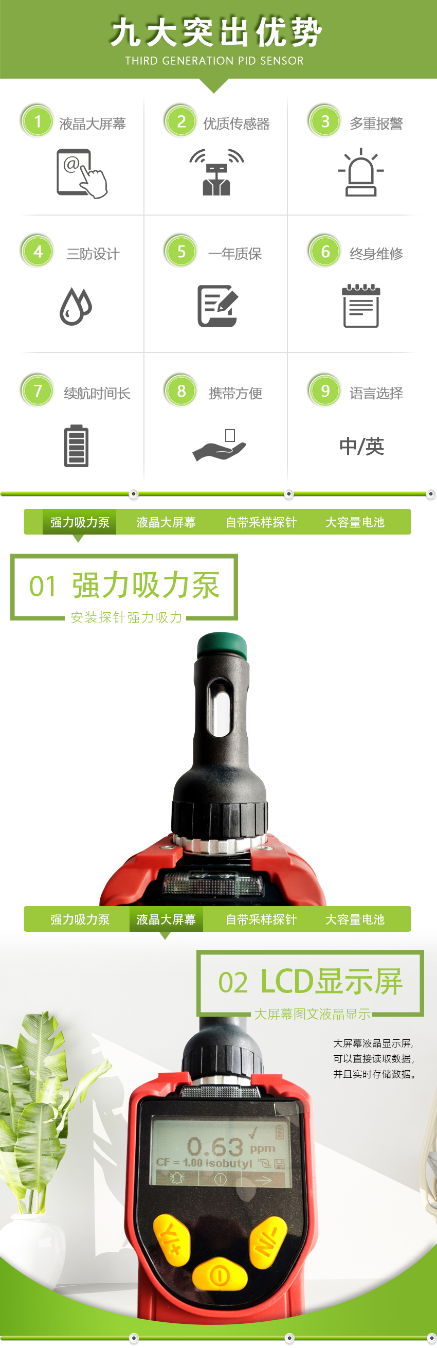 1、第三代PID傳感器,響應(yīng)時(shí)間短,檢測范圍寬