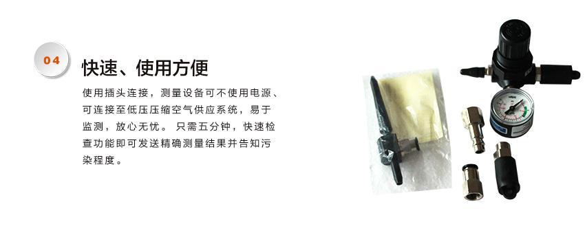 使用插頭連接,測量設備可不使用電源、可連接至低壓壓縮空氣供應系統,易于監測,放心無憂。 只需五分鐘,快速檢查功能即可發送精確測量結果并告知污染程度。