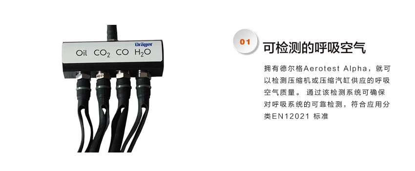 擁有德爾格Aerotest Alpha,就可以檢測壓縮機或壓縮汽缸供應的呼吸空氣質量。 通過該檢測系統可確保對呼吸系統的可靠檢測,符合應用分類EN12021 標準。