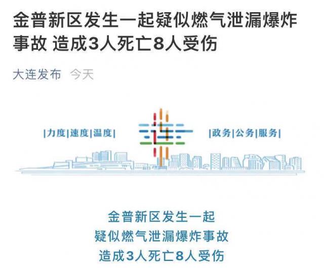 1月25日6時左右,金普新區友誼街道金渤海憬小區公建房附近發生燃氣爆炸事故,造成3人死亡,8人輕傷,受傷人員已全部進行救治。