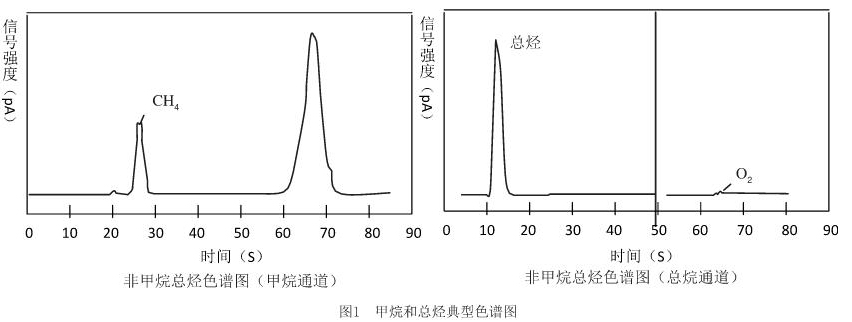 (1) 采用兩個定量環,兩根色譜柱,兩個FID檢測器測定總烴和甲烷的濃度,這種方法完全依照HJ/T38-1999標準方法配制,但儀器因配備兩個FID檢測器價格較高,色譜圖見圖1。