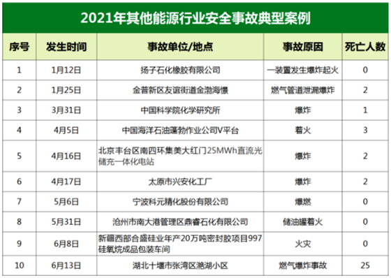 據(jù)國(guó)際能源網(wǎng)記者總結(jié):2021年上半年典型能源安全事故中,其他能源行業(yè)安全事故多為火災(zāi)事故。天然氣、化工廠、儲(chǔ)能電站是火災(zāi)事故隱患較為集中的領(lǐng)域,這些領(lǐng)域中防火、防爆是預(yù)防事故發(fā)生的重點(diǎn)工作。