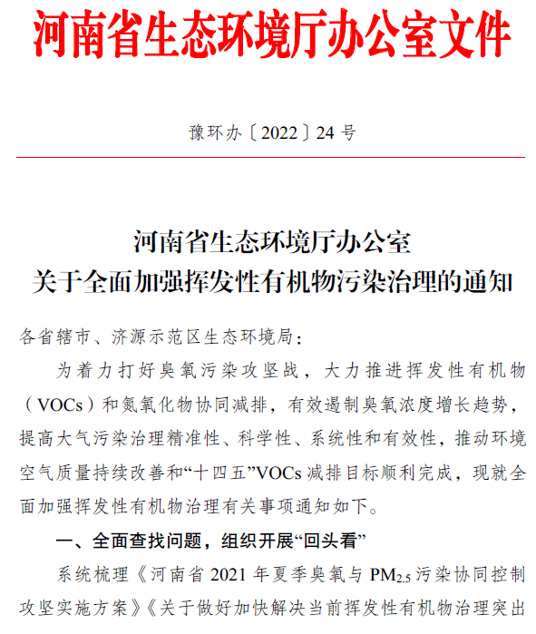 2022.4.12日,河南省生態環境廳印發了《關于全面加強揮發性有機物污染治理的通知》(豫環辦〔2022〕24號),為著力打好臭氧污染攻堅戰,大力推進揮發性有機物( VOCs)和氮氧化物協同減排,有效遏制臭氧濃度增長趨勢,提高大氣污染治理精準性、科學性、系統性和有效性,推動環境空氣質量持續改善和“十四五”VOCs減排目標順利完成,要求全面加強VOCS治理工作。