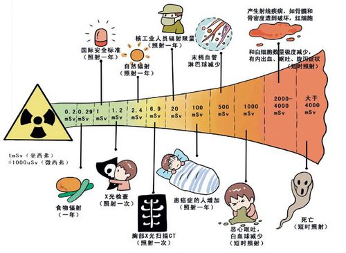 健康受損程度取決于暴露在輻射中的時間以及放射性物質的衰變中產生電離輻射。它能破壞人體組織里分子和原子之間的化學鍵,可能對人體重要的生化結構與功能產生嚴重影響。