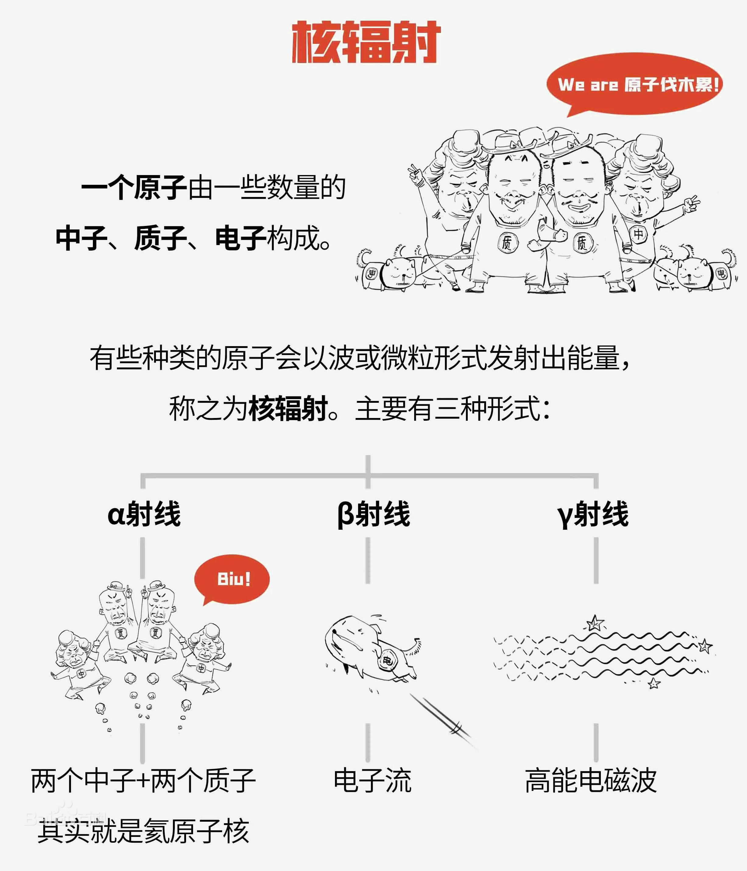 放射性物質以波或微粒形式發(fā)射出的一種能量就叫核輻射,核爆炸和核事故都有核輻射。核輻射主要是α、β、γ三種射線:
