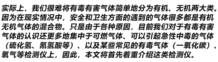 2、根據危害,我們將有毒有害氣體分為可燃氣體和有毒氣體兩大類。由于它們性質和危害不同,其檢測手段也有所不同。