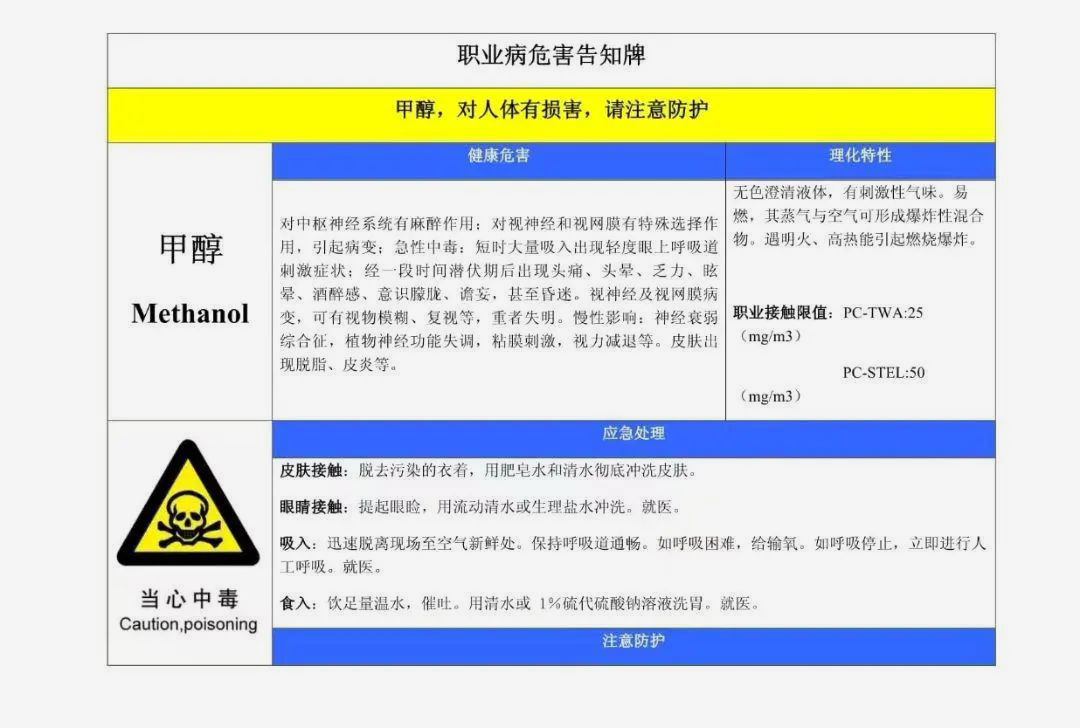 甲醇罐周圍設置圍堰或泄險池,并設置必要的噴淋設施。工作場所應設置固定式甲醇檢測報警儀。在不具備設置固定式甲醇檢測報警儀條件的工作場所,應設置便攜式甲醇檢測報警儀。用人單位應在甲醇生產或使用場所便于觀察處設置醒目的風向標,便于撤離人員選擇應急疏散路線和安全集結區(qū)域。在工作場所的醒目位置設置職業(yè)病危害警示標識和中文警示說明。